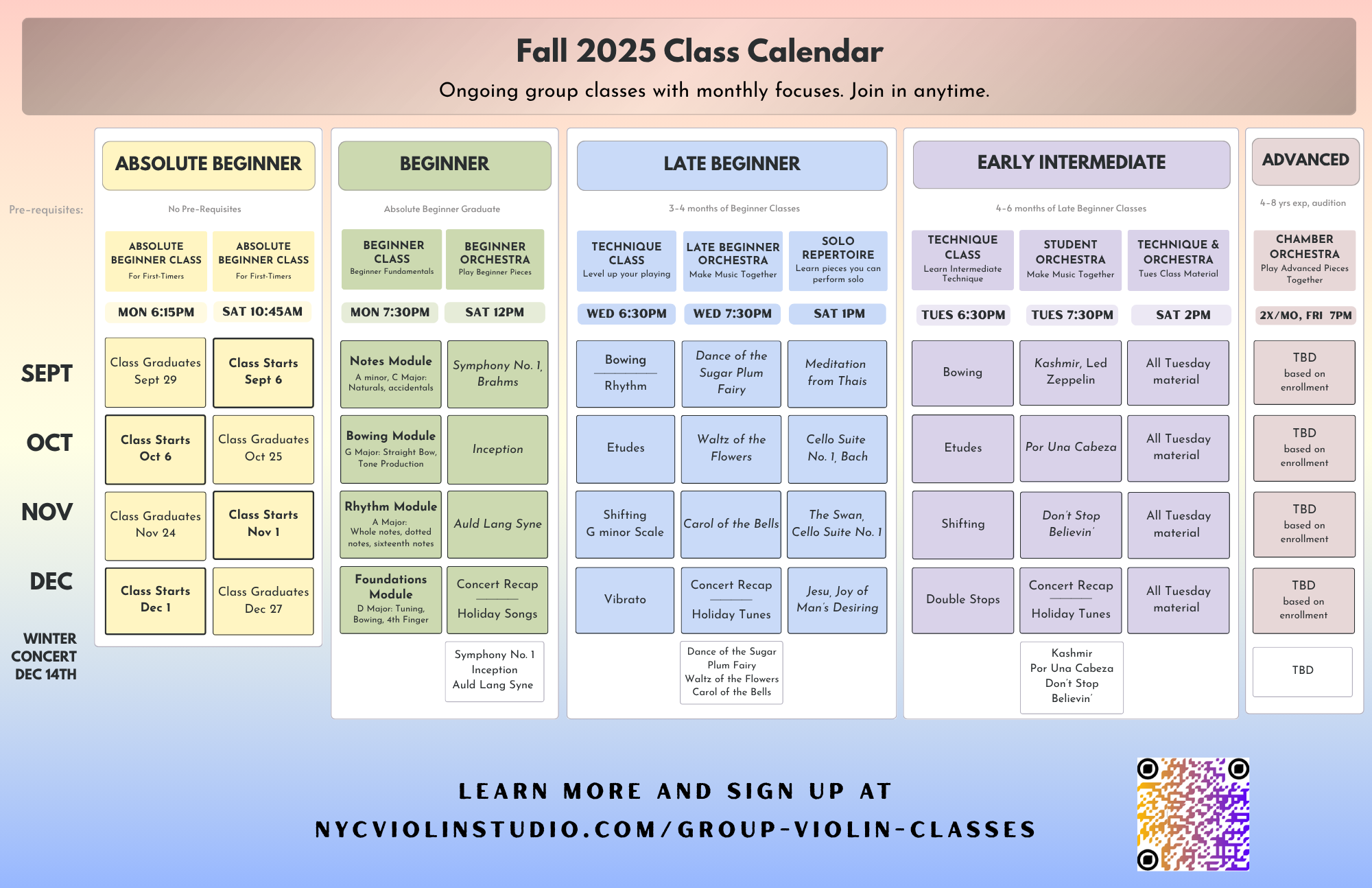 What: NYC Violin Students of all levels will perform solo, duet, and ensemble pieces for friends and family. All are welcome to attend the concert or perform!