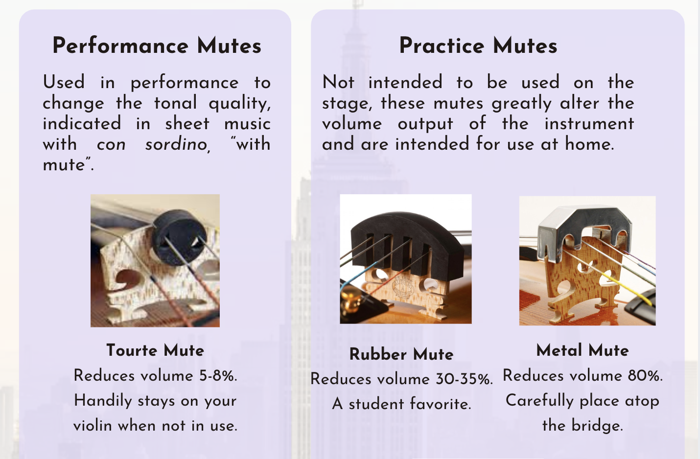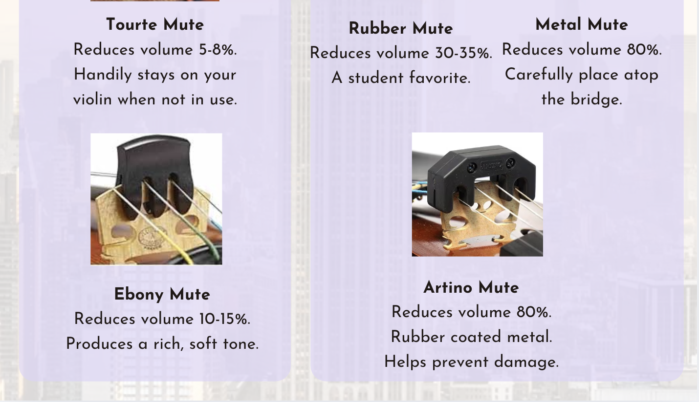 The quickest, easiest fix is to use a mute. A mute is a device that temporarily attaches to the bridge of your instrument to dampen the vibration, which ultimately reduces the volume output. They come in various shapes and sizes, but these are the most popular.
