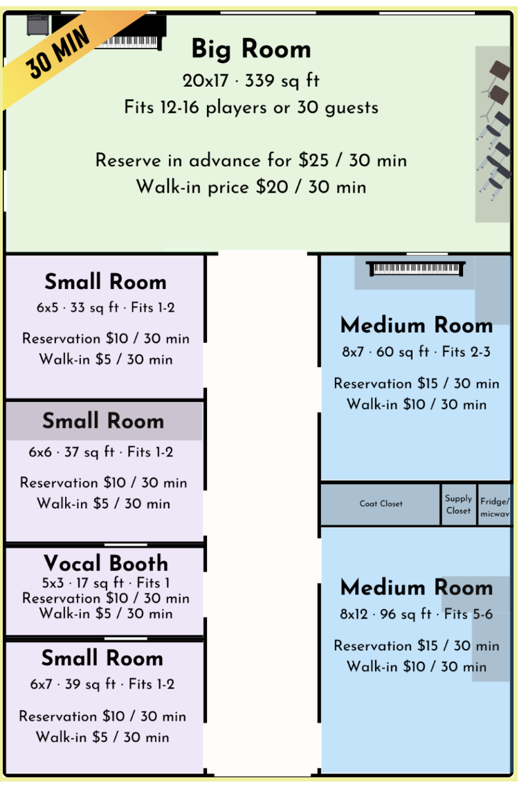 Did you know we rent out practice rooms? That’s right! Before or after your class, or whenever is convenient for you, you can book a practice room right in the studio. We even have same day discounts!